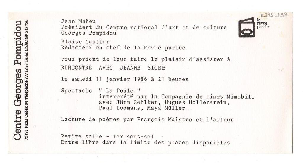 Έντυπο, μονόφυλλο, χαρτόνι, μία όψη, 10,5×21,0 εκ. Πρόσκληση εκδήλωσης με τίτλο “Rencontre avec Jeanne Sigée, που πραγματοποιήθηκε στο Παρίσι τον Ιανουάριο του 1986. Στο πλαίσιο της εκδήλωσης παρουσιάστηκε το δρώμενο με τίτλο “La Poule” από τον θίασο μίμων “Mimobile” και διαβάστηκαν ποιήματα από τον Francois Maistre.