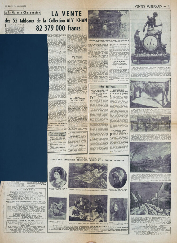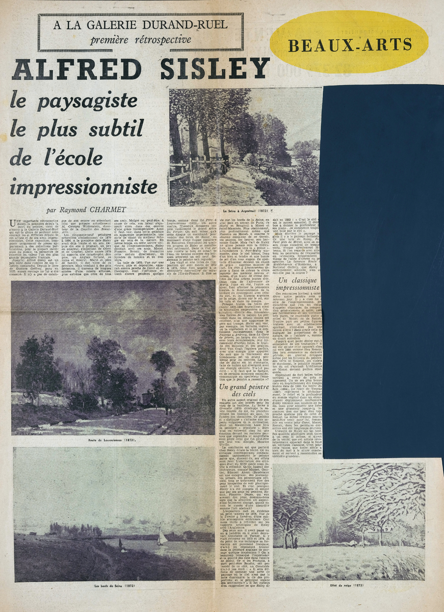 Απόκομμα, έντυπο, χαρτί, 60×42 εκ., όπου δημοσιεύεται, στα γαλλικά, άρθρο του Raymond Charmet για την αναδρομική έκθεση του Alfred Sisley στο Παρίσι το 1957. Στο ίδιο απόκομμα: “La vente de 52 tableaux de la Collection Aly Khan”.