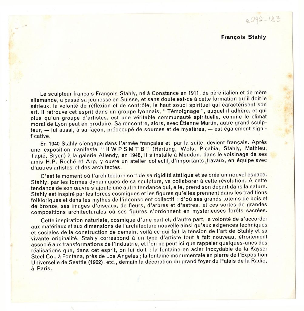 Απόκομμα, έντυπο, χαρτί ιλουστρασιόν, 2 φφ., 18,0×18,0 εκ. Απόσπασμα εντύπου έκθεσης με βιογραφικό σημείωμα και αναπαραγωγές έργων του François Stahly.