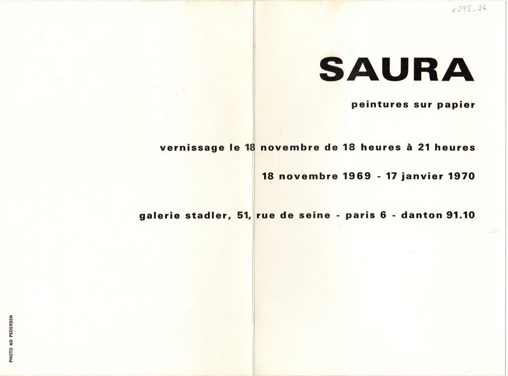 Έντυπο, στα γαλλικά, μονόφυλλο, 21,0×28,0 εκ., χαρτόνι ιλουστρασιόν. Πρόσκληση της ατομικής έκθεσης έργων του Antonio Saura, που πραγματοποιήθηκε στο Παρίσι το 1970.