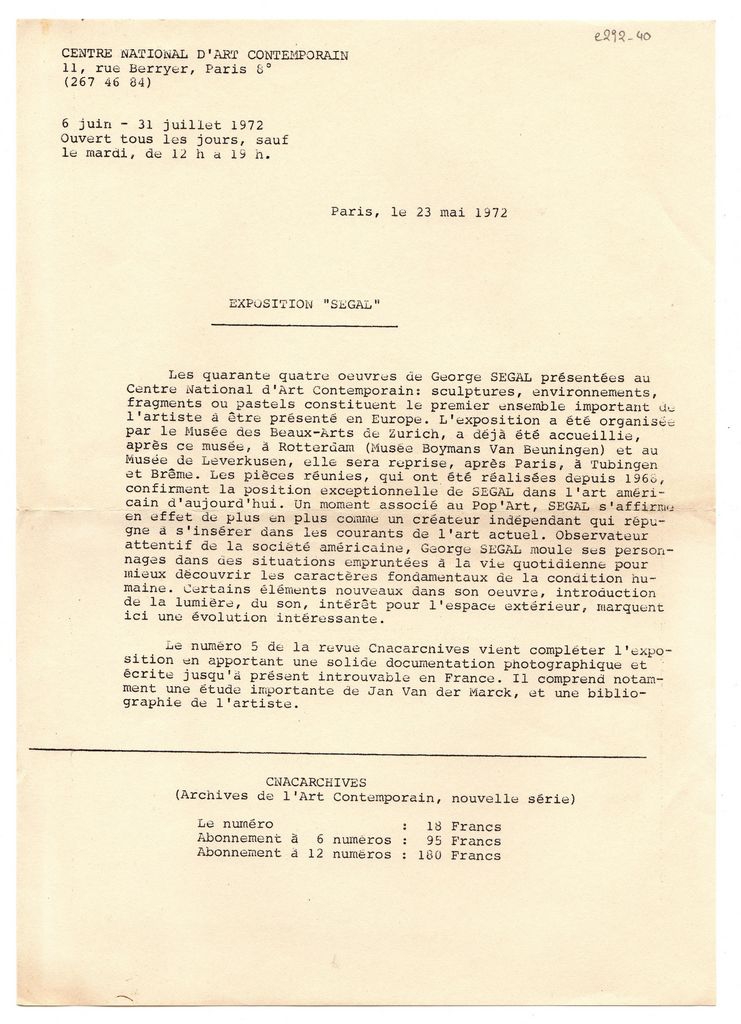 Κείμενο, στα γαλλικά, δακτυλόγραφο, χαρτί, μία όψη, 29,8×21,0 εκ. Δελτίο τύπου της ατομικής έκθεσης έργων του Αμερικανού γλύπτη George Segal που πραγματοποιήθηκε στο Παρίσι το καλοκαίρι του 1972.