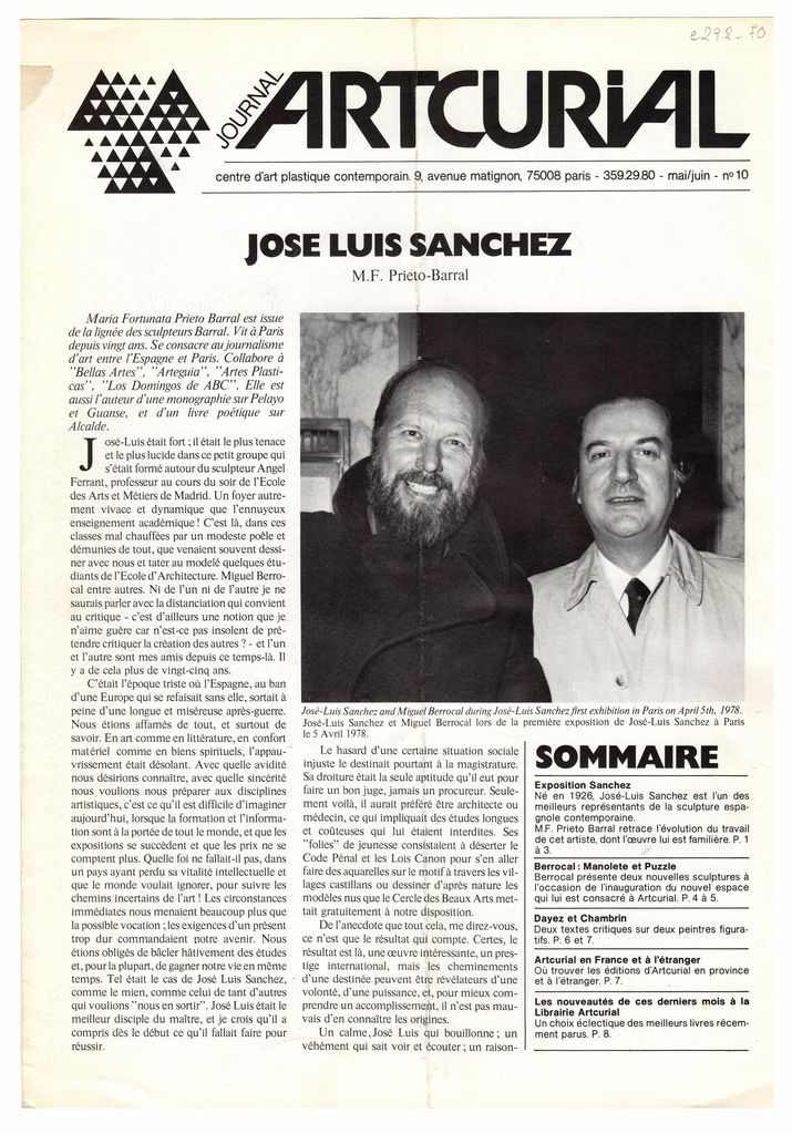 Έντυπο, οκτασέλιδο, χαρτί, 30,5×22,0 εκ., όπου δημοσιεύεται, στα γαλλικά, άρθρο του M.F. Prieto-Barral για τον ζωγράφο José Luis Sanchez. Στο ίδιο τεύχος: “Berrocal”, Jean-Jaques Lévêque “Dayez”, Henri Cahin “Chabrin”, “Artcurial en France et à l’etranger” και “La Librairie d’Artcurial” με τις πρόσφατες εκδόσεις τέχνης της περιόδου