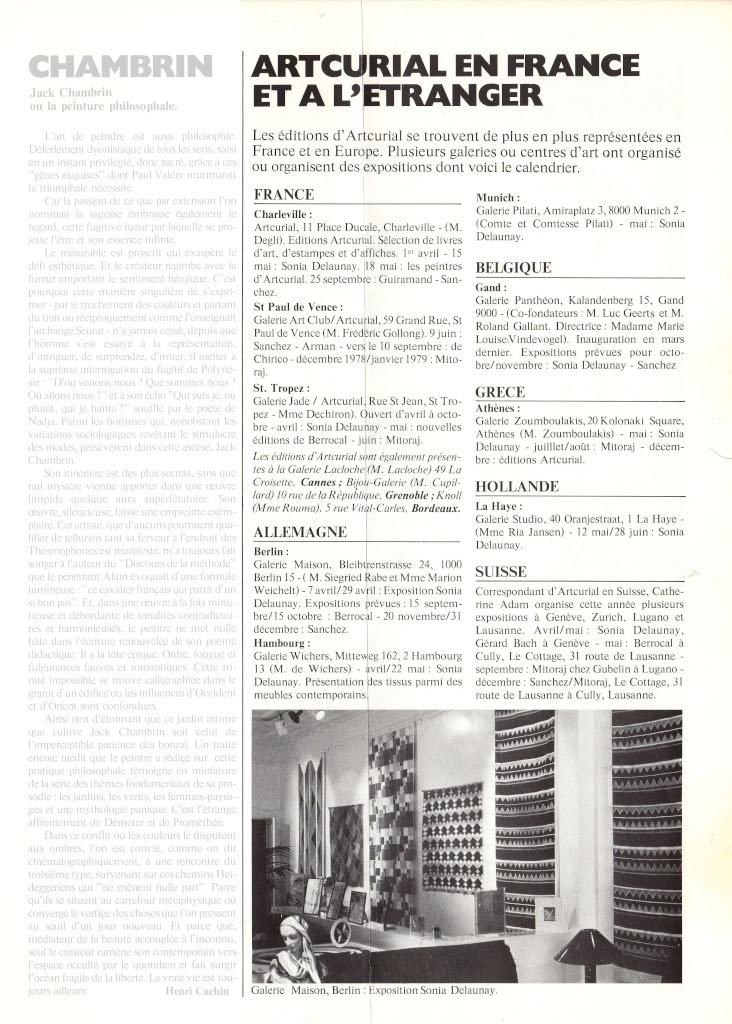 Έντυπο, οκτασέλιδο, χαρτί, 30,5×22,0 εκ., όπου δημοσιεύονται, στα γαλλικά, αναγγελίες των εκθέσεων που διοργανώνει η γκαλερί Artcurial στη Γαλλία και σε άλλες ευρωπαϊκές χώρες. Στο ίδιο τεκμήριο: M.F. Prieto-Barral “José Luis Sanchez”, Jean-Jaques Lévêque για τον Γάλλο ζωγράφο Georges Dayez, Henri Cachin “Jack Chambrin” και “La Librairie d’Artcurial” με τις πρόσφατες εκδόσεις τέχνης της περιόδου.