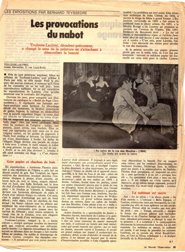 Απόκομμα, χαρτί, 30×23.5 εκ., στα γαλλικά, δημοσίευσης κριτικής έκθεσης Toulouse Lautrec, η οποί διεξάγεται στο Musée Marmottan στο Παρίσι. Τα έργα μεταφέρονται από το μουσείο της γενέτειρας του καλλιτέχνη, Albi, προκειμένου να εκτεθούν στο Παρίσι.