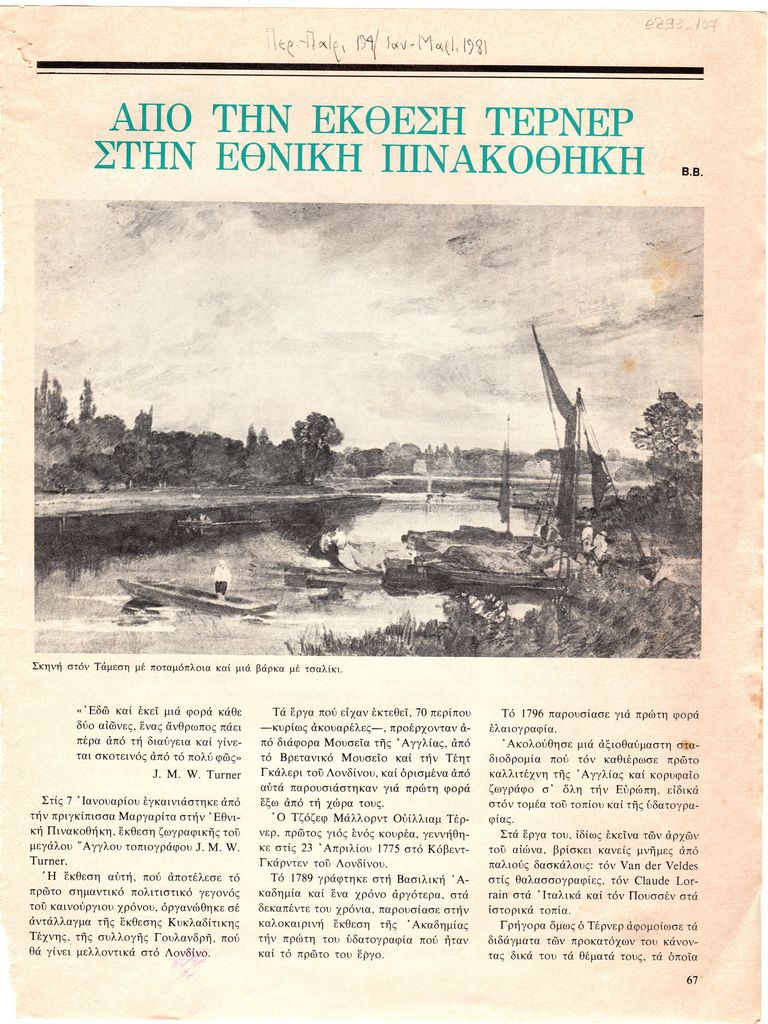 Απόκομμα, χαρτί, 3 φφ, 30×23 εκ., στα ελληνικά, δημοσίευσης κριτικής αναδρομικής έκθεσης William Turner, η οποία διεξάγεται στην Εθνική Πινακοθήκη-Μουσείο Αλέξανδρου Σούτζου στην Αθήνα. Αναγράφονται λεπτομέρειες και σχόλια για την διοργάνωση και το περιεχόμενό της.