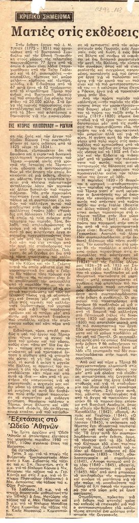 Απόκομμα, χαρτί, 39×11 εκ., στα ελληνικά, δημοσίευσης κριτικής αναδρομικής έκθεσης William Turner, η οποία διεξάγεται στην Εθνική Πινακοθήκη-Μουσείο Αλέξανδρου Σούτζου στην Αθήνα. Σχολιάζεται το εικαστικό του έργο.