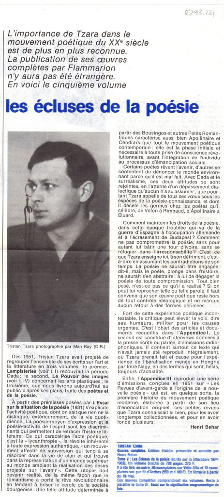Απόκομμα, χαρτί, 29×14 εκ., στα γαλλικά, δημοσίευσης άρθρου αναφερόμενου στην κυκλοφορία του 5ου τόμου ποιημάτων του Tristan Tzara, που κυκλοφορεί από τις εκδόσεις Flammarion.
