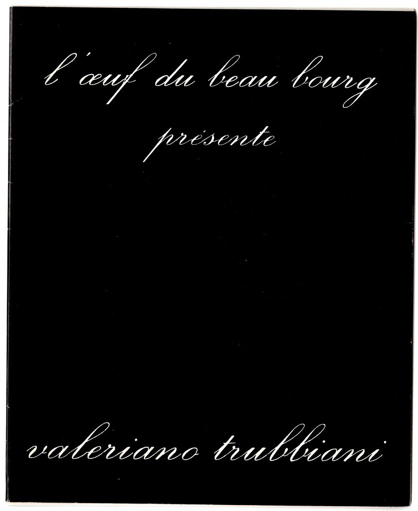Έντυπο, χαρτόνι δίπτυχο και σκληρό χαρτί, 22×17 εκ., στα γαλλικά, έκθεσης Valeriano Trubbiani, η οποία διεξάγεται στην γκαλερί L’ Oeil de Beaubourg στο Παρίσι. Περιέχει κείμενα των Pierre Restany και Patrick Waldberg για τον καλλιτέχνη και βιογραφικό σημείωμα.