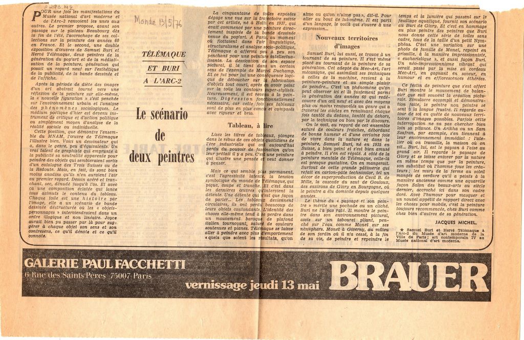 Απόκομμα, χαρτί, 21×33 εκ., στα γαλλικά, δημοσίευσης κριτικής ομαδικής έκθεσης των Samuel Buri και Hervé Télémaque, η οποία διεξάγεται στο Μουσείο Μοντέρνας Τέχνης της πόλης του Παρισιού.