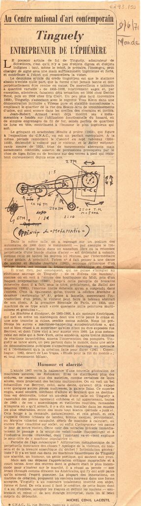 Απόκομμα, χαρτί, 45×12 εκ., στα γαλλικά, δημοσίευσης κριτικής έκθεσης του Jean Tinguely, η οποία διεξάγεται στο CNAC στο Παρίσι. Σχολιάζονται τα έργα που παρουσιάζονται σε αυτή.