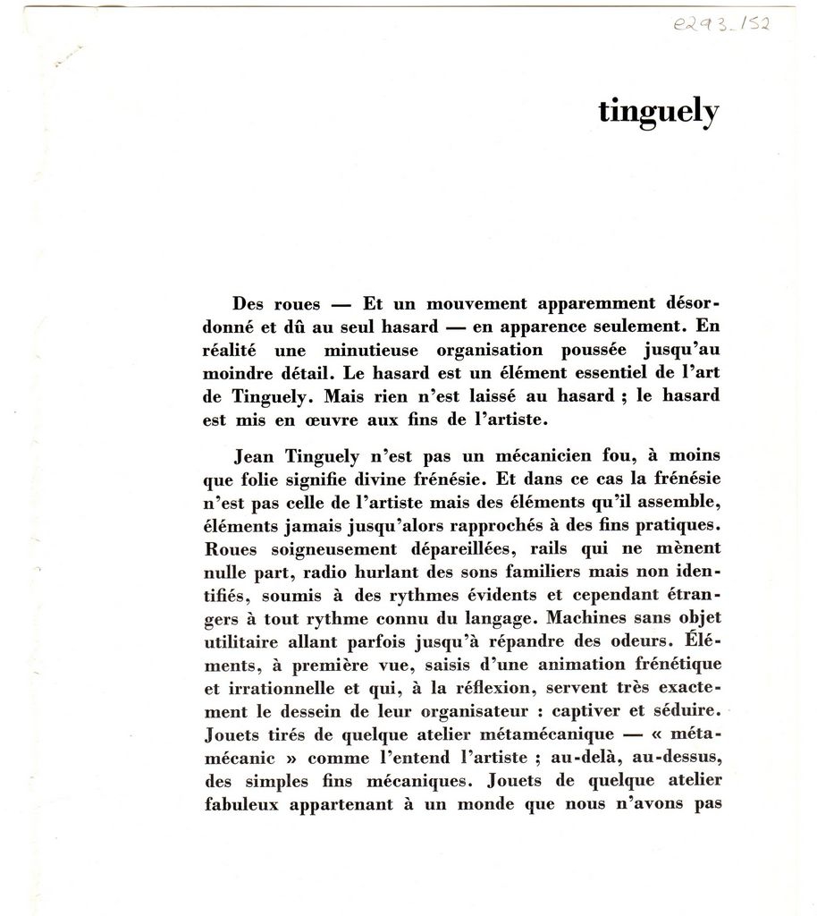 Απόκομμα, χαρτί, 3 φφ, 21×17.5 εκ., στα γαλλικά, δημοσίευσης κειμένου αναφερόμενου στο εικαστικό έργο του Jean Tinguely.