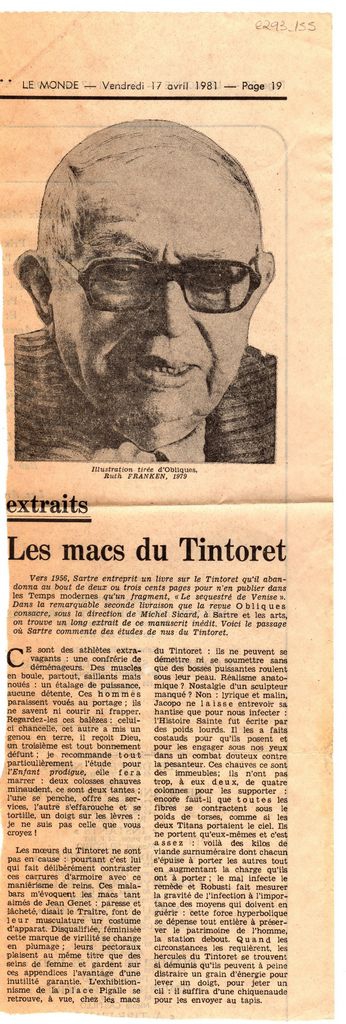 Απόκομμα, χαρτί, 33×11 εκ., στα γαλλικά, δημοσίευσης τμήματος κειμένου του Jean Paul Sartre, για τον Tintoretto, το οποίο δημοσιεύτηκε στο περιοδικό ‘Obliques’.