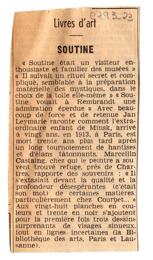 Απόκομμα, χαρτί, 10×5 εκ., στα γαλλικά, δημοσίευσης άρθρου το οποίο αναφέρεται σε κυκλοφορία βιβλίου των M. Castaing και J. Leymarie για τον Chaim Soutine. Δίνονται αποσπάσματα κρίσεων για τον καλλιτέχνη.