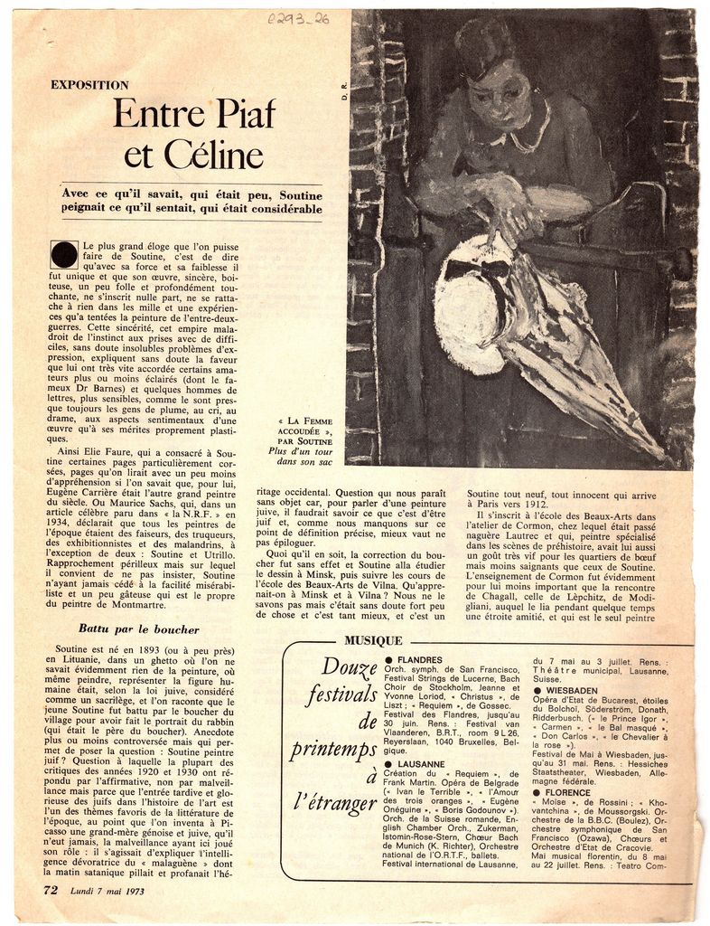 Απόκομμα, χαρτί, 2 φφ, 30×22.5 εκ., στα γαλλικά, δημοσίευσης κριτικής έκθεσης Chaim Soutine, η οποία διεξάγεται στην Orangerie στο Παρίσι. Σχολιάζεται η ζωγραφική του καλλιτέχνη και αναγράφονται λεπτομέρειες για την καλλιτεχνική του πορεία.