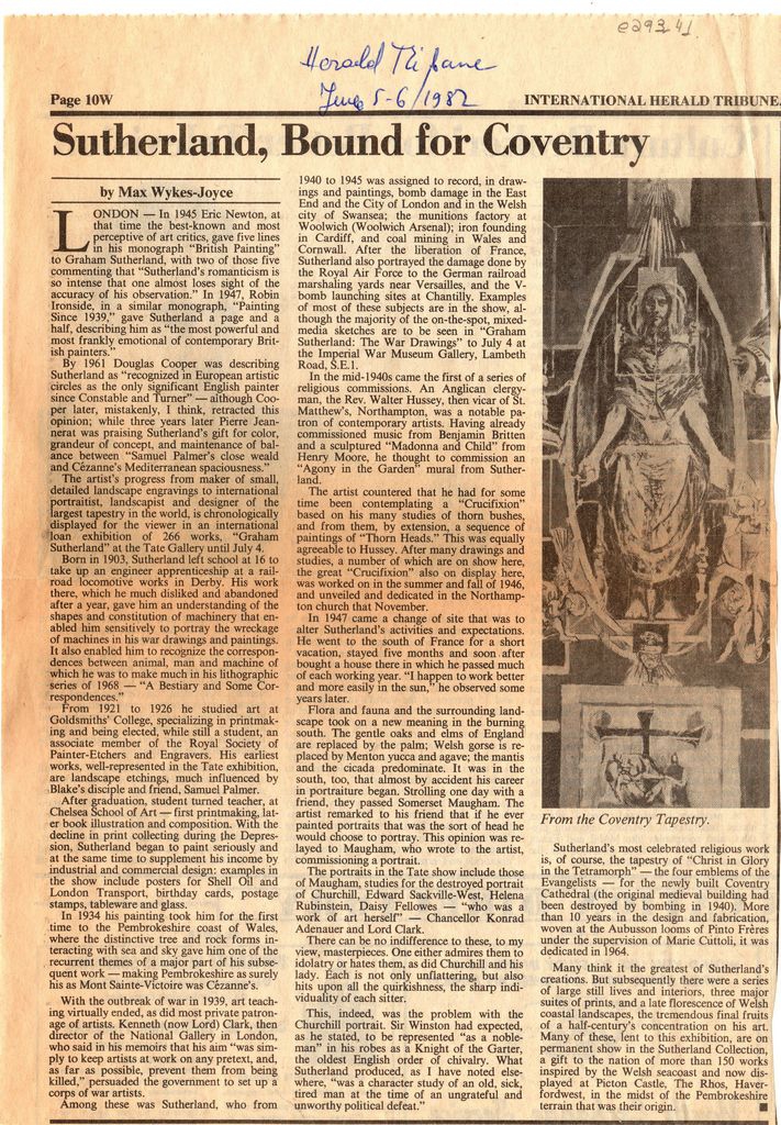 Απόκομμα, χαρτί, 29×20 εκ., στα αγλλικά, δημοσίευσης άρθρου το οποίο αναφέρεται στον Graham Sutherland. Σχολιάζεται το εικαστικό έργο του καλλιτέχνη και ορισμένα από τα πιο χαρακτηριστικά του έργα και γίνεται μια αναδρομή στην καλλιτεχνική του πορεία.