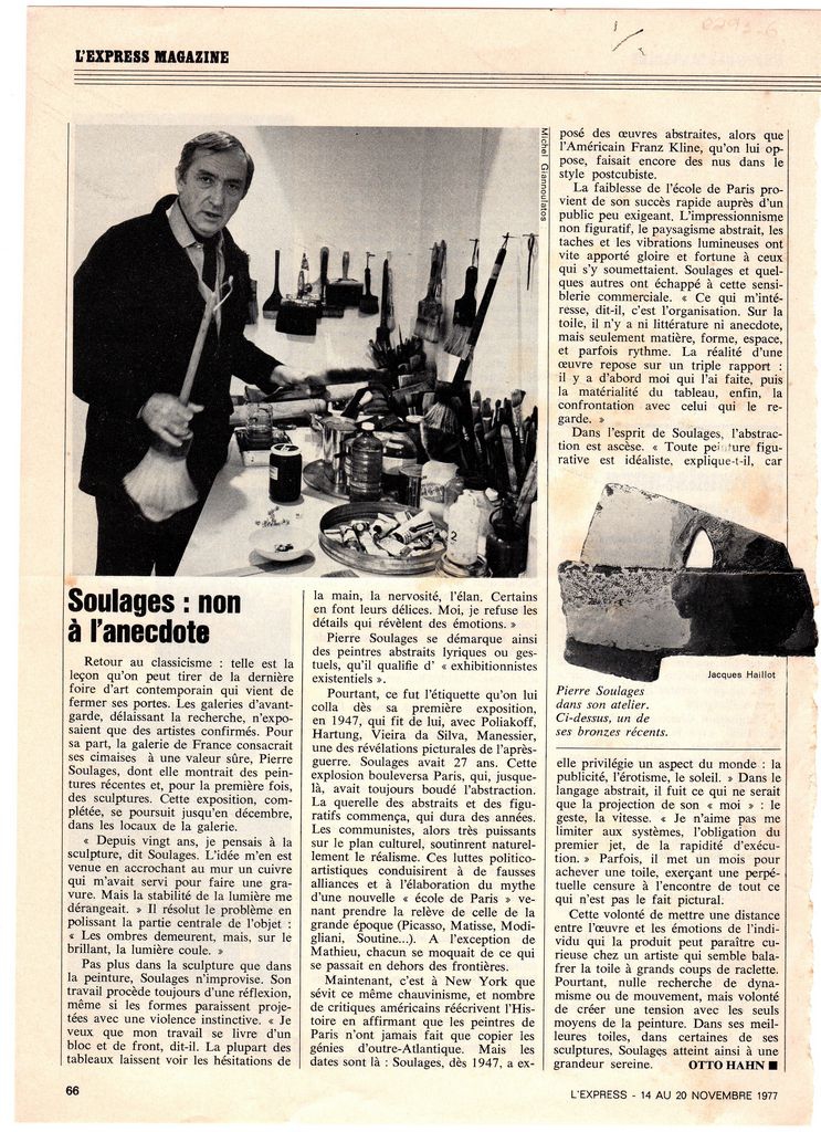 Απόκομμα, χαρτί, 28×21 εκ., στα γαλλικά, δημοσίευσης κριτικής έκθεσης Pierre Soulages, η οποία διεξάγεται στην Galerie de France στο Παρίσι.