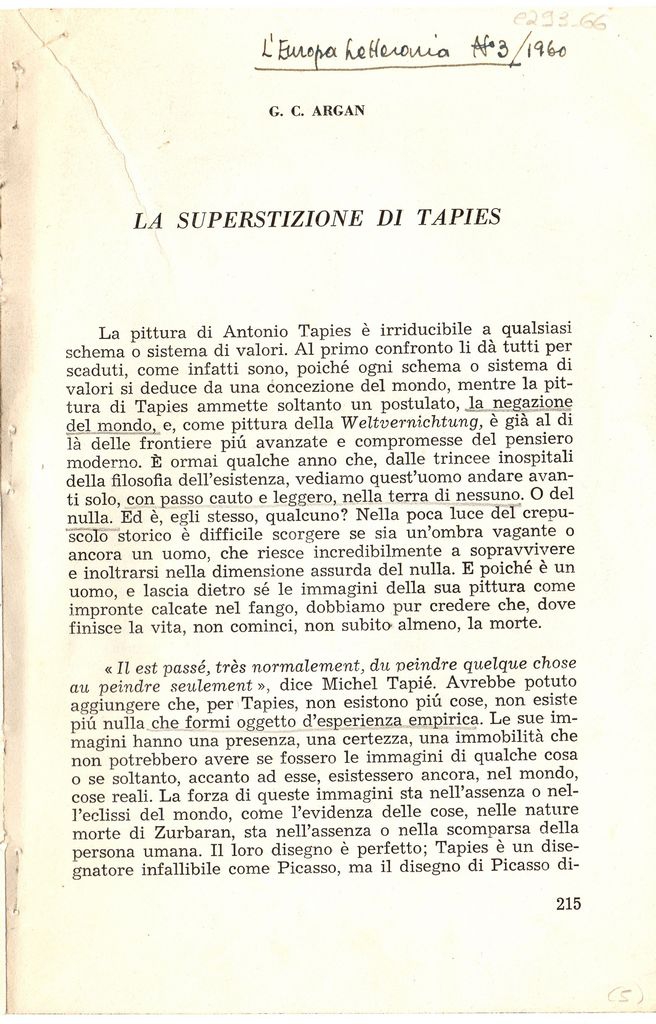 Απόκομμα, χαρτί, 5 φφ, 21×14 εκ., στα ιταλικά, δημοσίευσης κειμένου αφιερωμένου στον Antoni Tàpies. Αναγράφονται λεπτομέρειες για το εικαστικό του έργο.