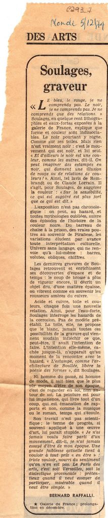 Απόκομμα, χαρτί, 34×7 εκ., στα γαλλικά, δημοσίευσης κριτικής έκθεσης Pierre Soulages, η οποία διεξάγεται στην Galerie de France στο Παρίσι.
