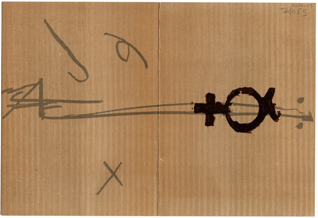 Πρόσκληση, χαρτόνι αναδιπλωμένο, 22×16 εκ., στα καταλανικά, εγκαινίων έκθεσης Antoni Tàpies, η οποία διεξάγεται στην γκαλερί Maeght στην Βαρκελώνη.