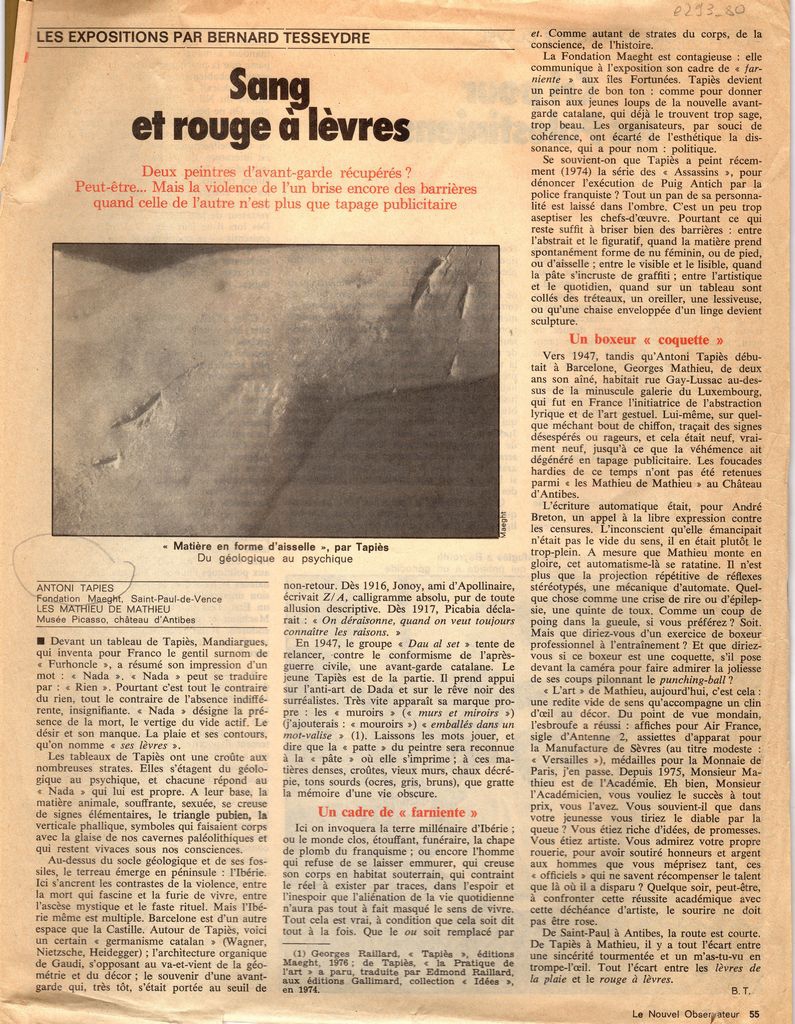 Απόκομμα, χαρτί, 30×23 εκ., στα γαλλικά, δημοσίευσης κριτικής εκθέσεων των Antoni Tàpies και Georges Mathieu, οι οποίες διεξάγονται στην Fondation Maeght και στο Μουσείο Picasso αντίστοιχα. Σχολιάζεται η ζωγραφική τους και το περιεχόμενο των εκθέσεων.