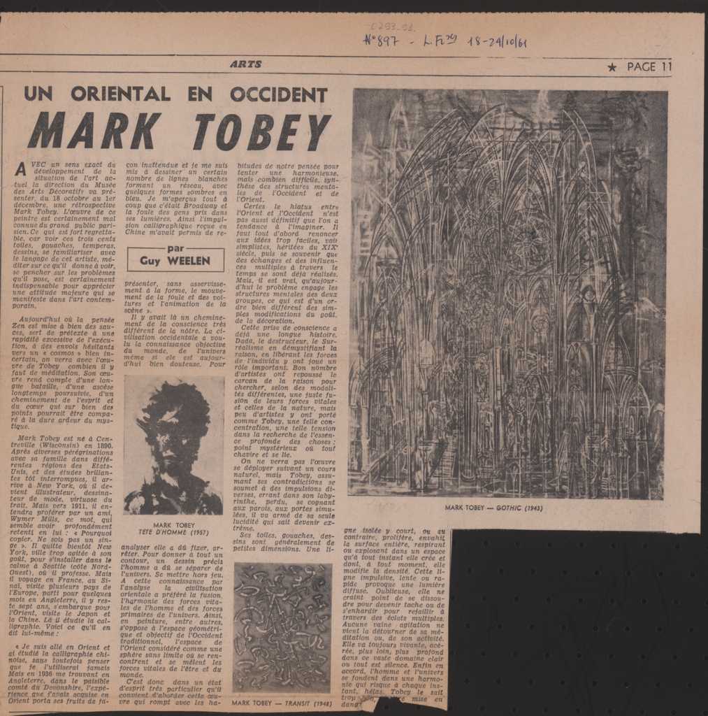 Απόκομμα, χαρτί ακανόνιστου μεγέθους, στα γαλλικά, δημοσίευσης κριτικής έκθεσης Marc Tobey, η οποία διεξάγεται στο Musée des Arts Décoratifs στο Παρίσι. Αναγράφονται βιογραφικά του καλλιτέχνη και δίνεται κείμενό του για το εικαστικό του έργο.