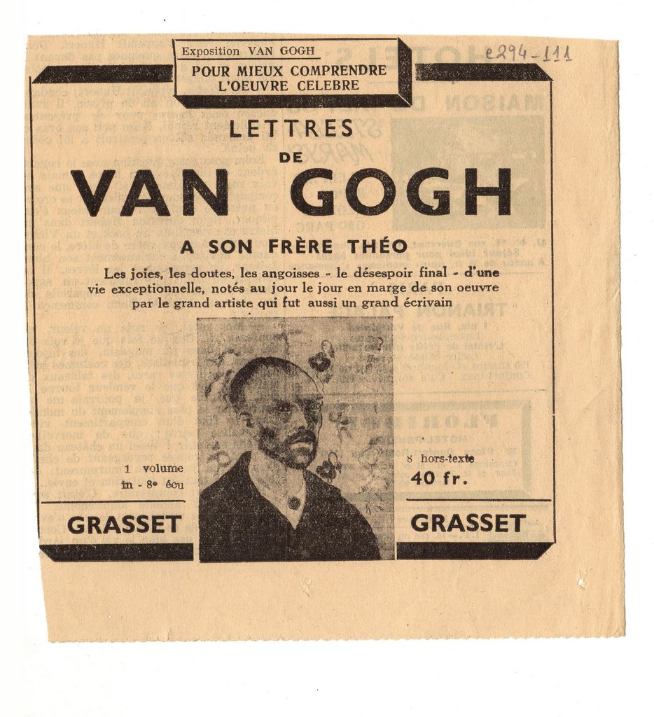 Απόκομμα, έντυπο, χαρτί, 15,0×15,0 εκ., όπου δημοσιεύεται, στα γαλλικά, διαφήμιση της έκδοσης της αλληλογραφίας του Ολλανδού καλλιτέχνη Vincent Van Gogh με τον αδελφό του Théo που κυκλοφόρησε από τις εκδόσεις Grasset το 1937.
