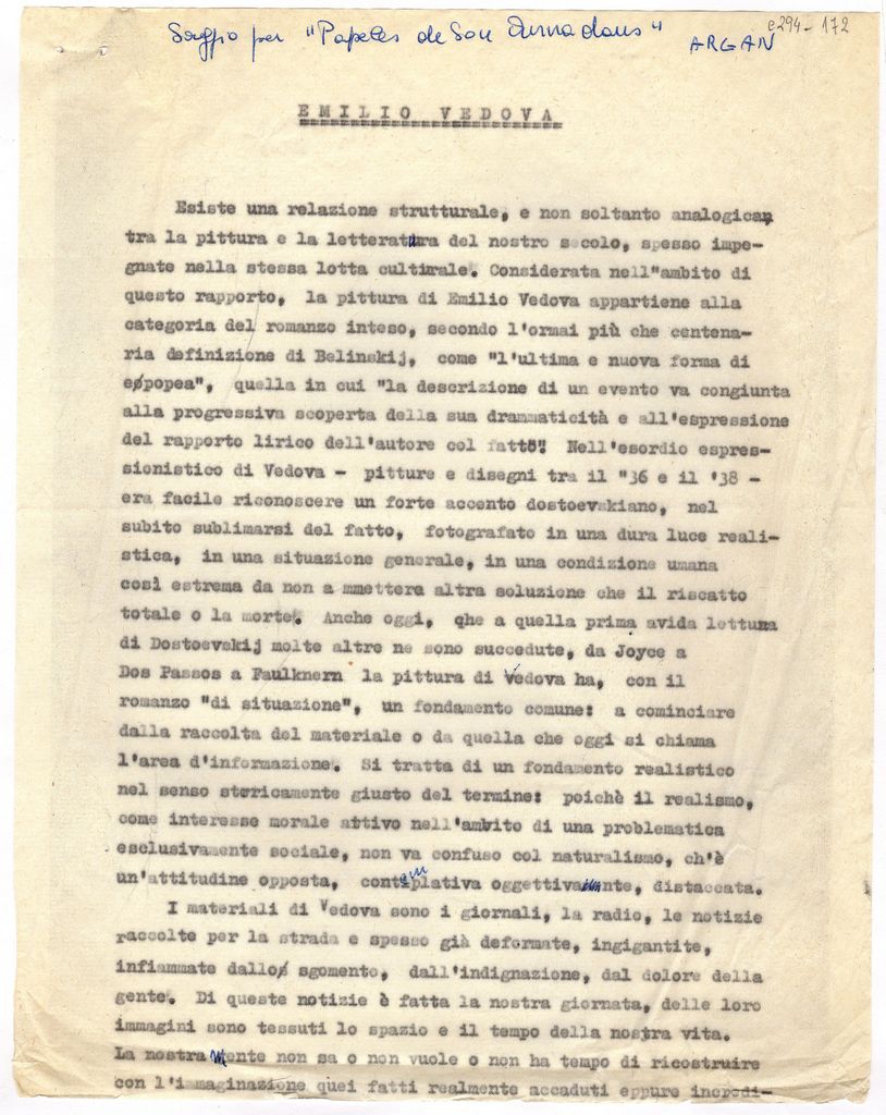Κείμενο, στα ιταλικά, δακτυλόγραφο, 5 φφ., με μαύρο μελάνι, χαρτί γραφομηχανής, 28,0×22,0 εκ. Προσχέδιο κειμένου του Giulio Carlo Argan, Emilio Vedova για την έκδοση με τίτλο “Emilio Vedova, Papeles de son Armadans” που κυκλοφόρησε από τον εκδοτικό οίκο Palma de Mallorca το 1962. Στην πρώτη σελίδα, επιγραφή.