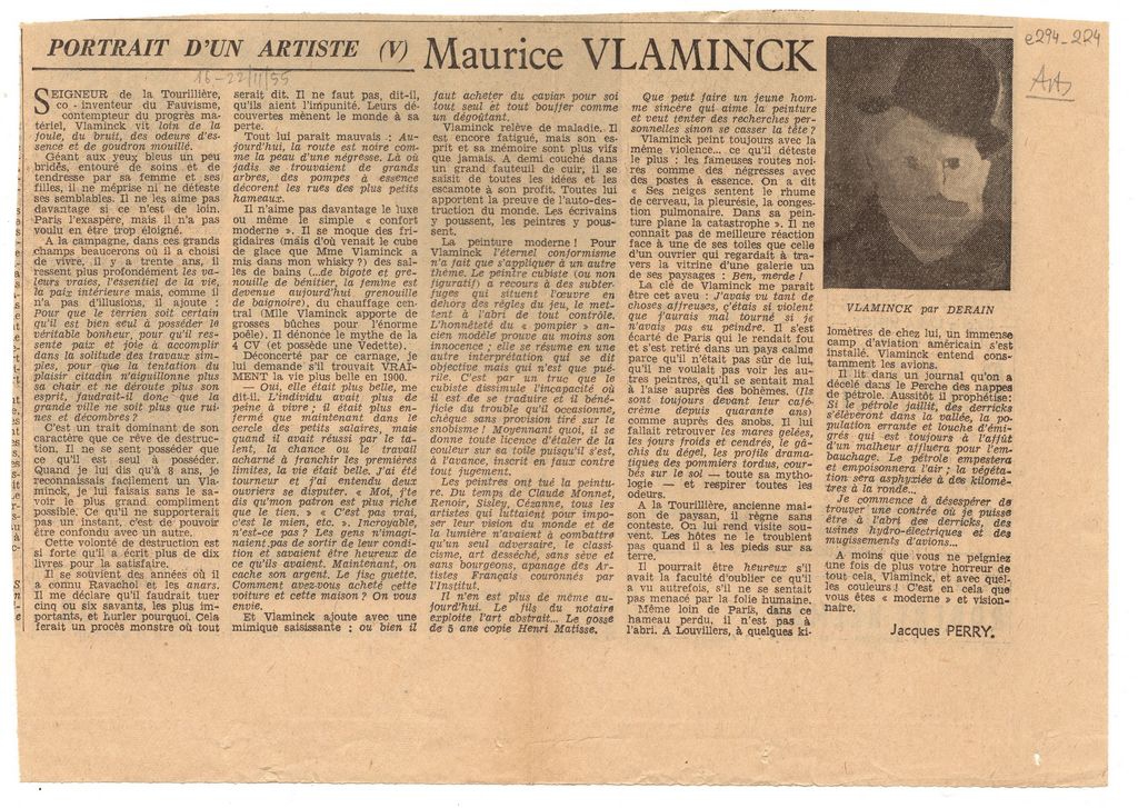 Απόκομμα, έντυπο, χαρτί, 19,0×27,0 εκ., όπου δημοσιεύεται, στα γαλλικά, άρθρο του Jacques Perry για το έργο του Γάλλου ζωγράφου Maurice de Vlaminck. Επιγραφή με τα στοιχεία της δημοσίευσης. Στην άλλη όψη, αναγγελίες εκθέσεων της περιόδου.