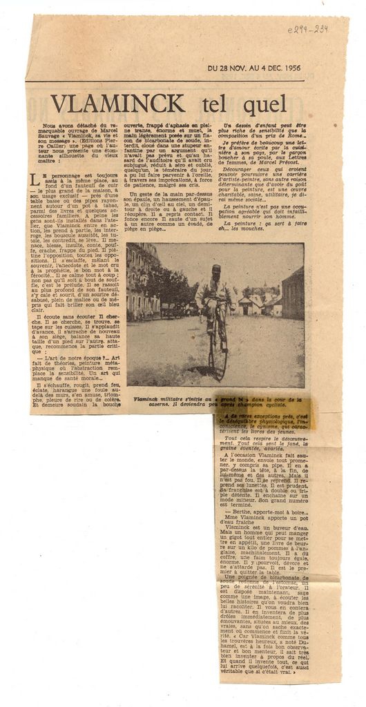 Απόκομμα, έντυπο, χαρτί, 35,0×16,5 εκ., όπου δημοσιεύεται, στα γαλλικά, απόσπασμα του βιβλίου του Marcel Sauvage “Vlaminck, sa vie et son message” που κυκλοφόρησε από τον εκδοτικό οίκο “Pierre Cailler” το 1956.