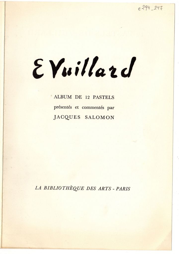 Έντυπο, στα γαλλικά, δίπτυχο, χαρτόνι, 24,0×16,5 εκ. Διαφημιστικό φυλλάδιο για την έκδοση άλμπουμ με 12 έργα παστέλ του Edouard Vuillard με σχόλια του Jacques Salomon που κυκλοφόρησε ο εκδοτικός οίκος “La bibliothωque de Arts, Paris”. Περιέχει κείμενο του Jacques Salomon.