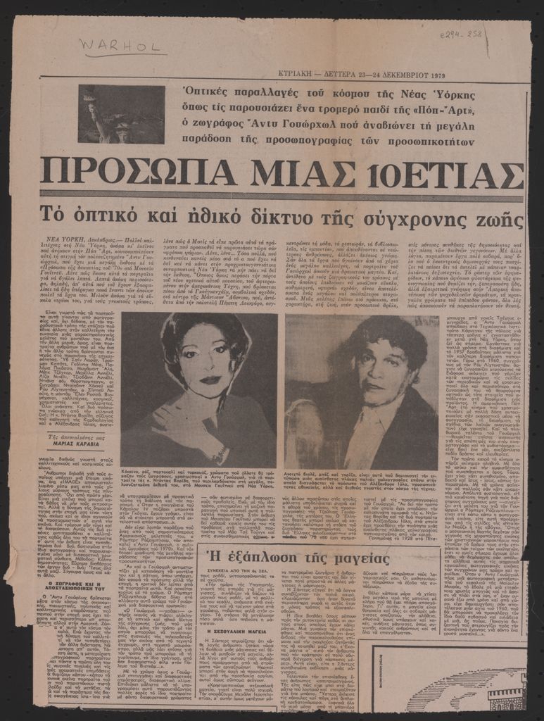 Απόκομμα, έντυπο, χαρτί, 43,0×32,0 εκ., όπου δημοσιεύεται, στα ελληνικά, άρθρο της Μαρίας Καραβία για την έκθεση πορτραίτων προσωπικοτήτων της δεκαετίας του ’70 του Αμερικανού καλλιτέχνη Andy Warhol που πραγματοποιήθηκε το 1979 στη Νέα Υόρκη. Επάνω, αριστερά επιγραφή.