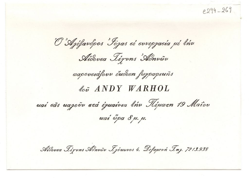 Έντυπο, στα ελληνικά, μονόφυλλο, χαρτόνι, μία όψη, 12,3×17,3 εκ. Πρόσκληση των εγκαινίων της ατομικής έκθεσης έργων του Αμερικανού εικαστικού καλλιτέχνη Andy Warhol που πραγματοποιήθηκε στην Αθήνα το 1983.