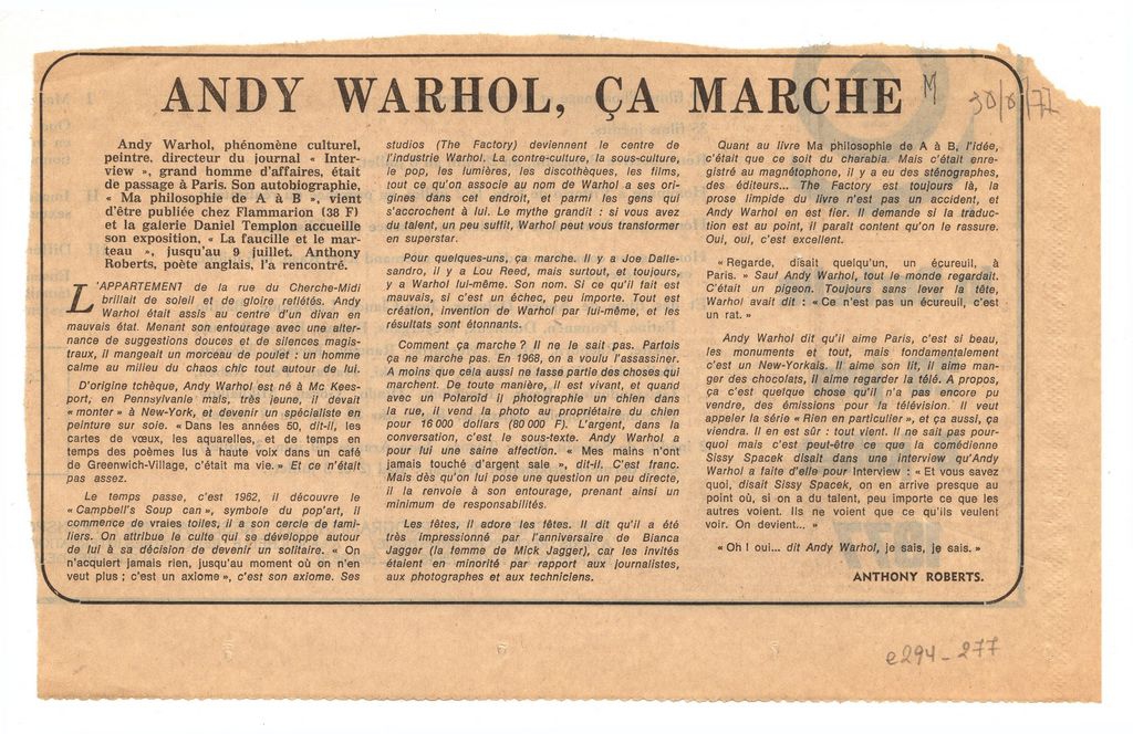 Απόκομμα, έντυπο, χαρτί, 15,0×24,0 εκ., όπου δημοσιεύεται, στα γαλλικά, κριτική του Βρετανού ποιητή Antony Roberts για την ατομική έκθεση έργων του Αμερικανού εικαστικού καλλιτέχνη Andy Warhol που πραγματοποιήθηκε στο Παρίσι το 1977. Πάνω δεξιά, επιγραφή με τα στοιχεία της δημοσίευσης.