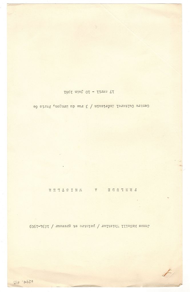 Κείμενο, στα γαλλικά, δακτυλόγραφο, 22 φφ., 33,0χ20,5 εκ. Πληροφοριακό υλικό της αναδρομικής έκθεσης έργων του Αμερικανού ζωγράφου James McNeill Whistler, που πραγματοποιήθηκε στο Παρίσι το 1961. Περιλαμβάνει κείμενο του Jean Vallery-Radot με τίτλο “James McNeill Whistler peintre et graveur” και κατάλογο των έργων της έκθεσης.