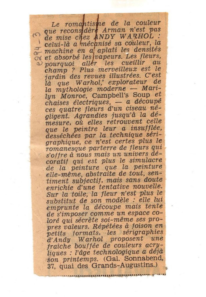 Απόκομμα, έντυπο, χαρτί, 10,5×5,4 εκ., όπου δημοσιεύεται, στα γαλλικά, κριτική έκθεσης του Andy Warhol στο Παρίσι.