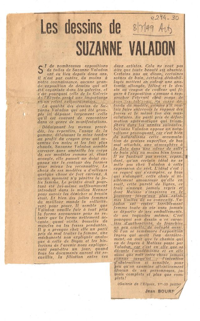 Απόκομμα, έντυπο, χαρτί, όπου δημοσιεύεται, στα γαλλικά, άρθρο του Jean Bouret για την έκθεση σχεδίων της Γαλλίδας ζωγράφου Suzanne Valadon που πραγματοποιήθηκε στο Παρίσι το 1949. Επάνω, επιγραφή με τα στοιχεία της δημοσίευσης.