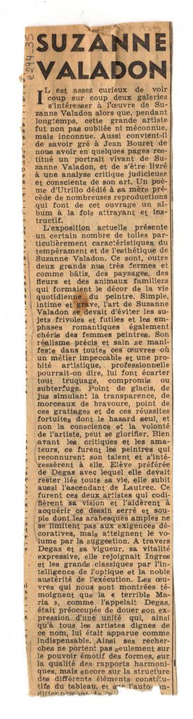Απόκομμα, έντυπο, χαρτί, 23,5×5,0 εκ., όπου δημοσιεύεται, στα γαλλικά, άρθρο για τη Γαλλίδα ζωγράφο Suzanne Valadon με αφορμή τη διοργάνωση δύο εκθέσεων έργων της στο Παρίσι το 1947 και την έκδοση της μονογραφίας του Jean Bouret με θέμα την προσωπικότητα και το έργο της που κυκλοφόρησε από τις Éditions O. Pétridès το 1947.