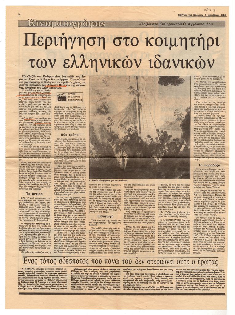 Απόκομμα, έντυπο, χαρτί, 38,8×28,7 εκ., όπου δημοσιεύεται, στα ελληνικά, άρθρο του Βασίλη Ραφαηλίδη για την κινηματογραφική ταινία του Θόδωρου Αγγελόπουλου “Ταξίδι στα Κύθηρα. Στο ίδιο απόκομμα: Ελ. Σπανοπούλου “Με πολύ ιδρώτα η ‘Κληρονόμος'”, Κώστας Τσαούσης “Ο ‘άγιος’ πειρατής κι ο ζωγράφος της εξουσίας” και σύντομη κριτική της έκθεσης του Γιώργου Παπακωνσταντή στην Αθήνα το 1984.