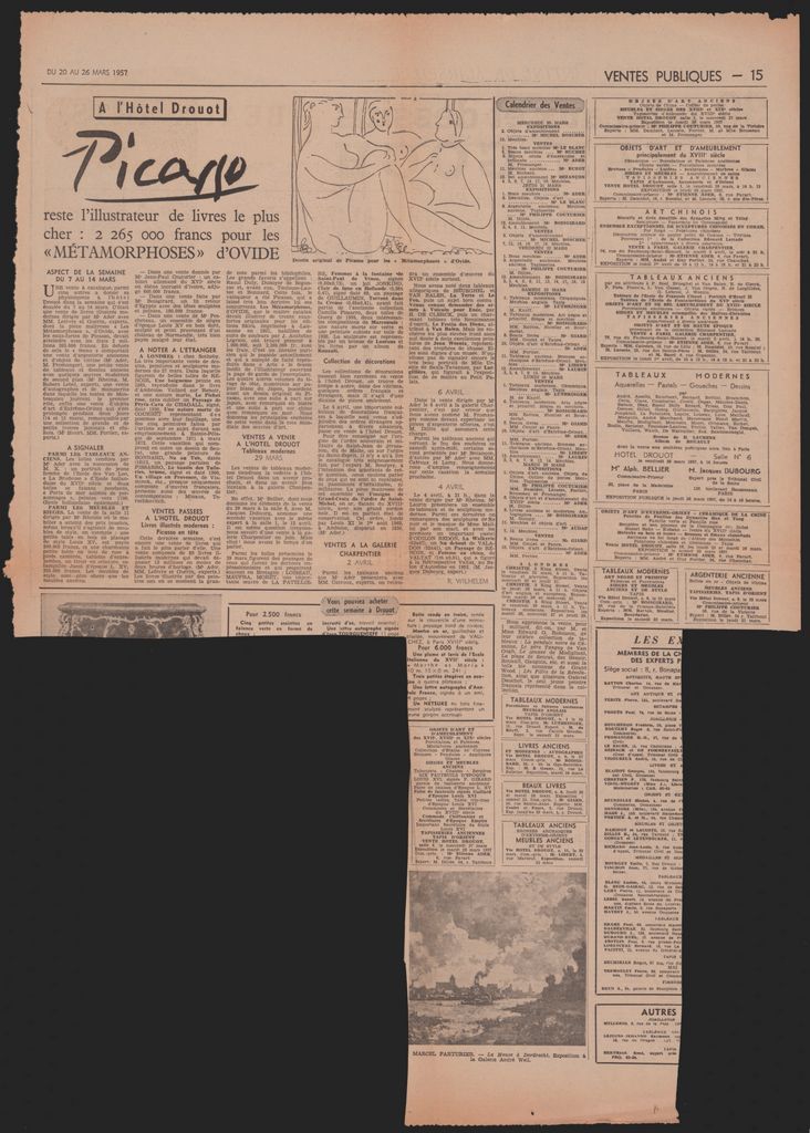 Απόκομμα, έντυπο, χαρτί, 60,0×42,0 εκ., όπου δημοσιεύεται, στα γαλλικά, άρθρο για τις δημοπρασίες στο Hotel Drouot στο Παρίσι που πραγματοποιήθηκαν από τις 7 Μαρτίου έως τις 4 Απριλίου του 1957. Στο ίδιο απόκομμα: Marie-Thérèse Maugis “Au Musée Cantini de Marseille. 90 tableaux et dessins de Van Gogh rappels de son séjour à Arles et à Saint-Rémy revivent sous le soleil du midi”.