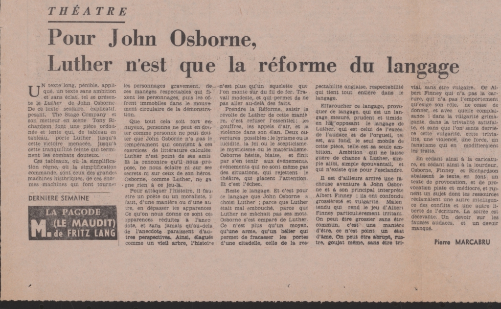 Απόκομμα, έντυπο, χαρτί, 60,0×42,0 εκ., όπου δημοσιεύεται, στα γαλλικά, άρθρο του Pierre Marcabru για το θεατρικό έργο του John Osborne “Luther”, που παρουσιάστηκε από την English Stage Company στο West End του Λονδίνου σε σκηνοθεσία Tony Richardson το 1961. Στην άλλη όψη: Gaëtan Picon “L’aventure de Van Gogh. L’homme qui voulait par la peinture faire accéder le monde à l’univers du sacré”, Jean Domarchi “Les pieges de Broadway”, Jacques Bourgeois “Au festival de Lyon”, Lucien Malson “Pendant huit hours le jazz du monde entier tient ses assises à Antibes”, Léonard Feather “Nouvelles d’Amérique”.