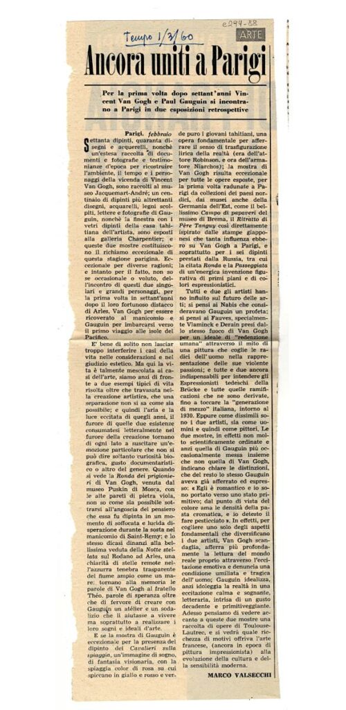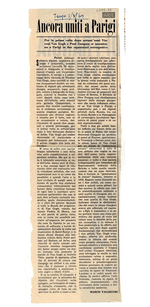Απόκομμα, έντυπο, χαρτί, 35,0×10,5 εκ., όπου δημοσιεύεται, στα ιταλικά, άρθρο του Marco Valsecchi σχετικά με τις αναδρομικές παράλληλες εκθέσεις έργων των Paul Gauguin Vincent Van Gogh που πραγματοποιήθηκαν στο Παρίσι το 1960.