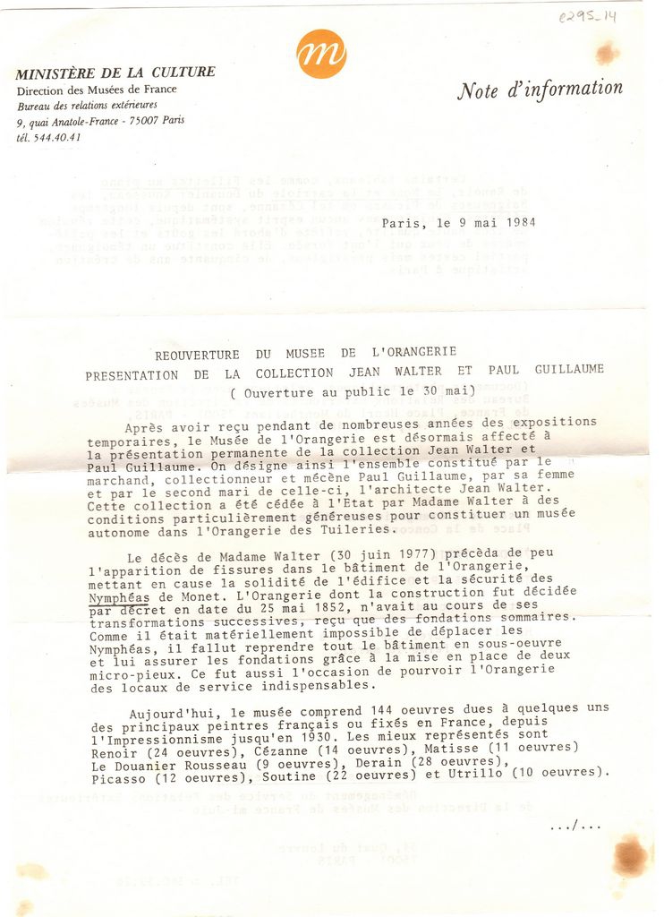 Δελτίο τύπου, χαρτί διπλής όψης, 30×21 εκ., στα γαλλικά, έκθεσης έργων της συλλογής έργων τέχνης των John Walter και Paul Guillaume η οποία διεξάγεται στην Orangerie του Παρισιού σηματοδοτώντας το νέο άνοιγμά της. Αναγράφονται λεπτομέρειες.