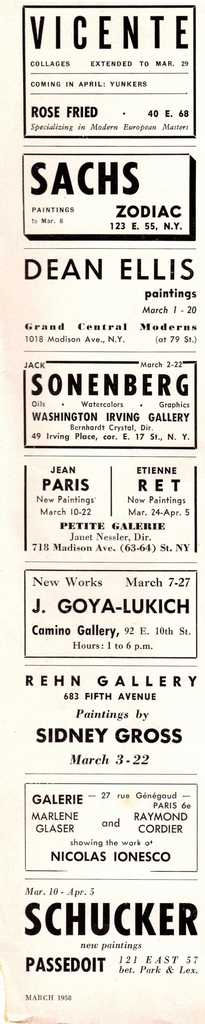 Απόκομμα, χαρτί, 31×23 εκ., στα αγγλικά, δημοσίευσης εκθεσιολογίου της περιόδου. Αναγράφονται αυτές των Vicente, Sachs, Dean Ellis, Jack Sonenberg, Jean Paris, Etienne Ret, J. Goya-Lukich, Sidney Gross, Nicolas Ionesco, Schucker.
