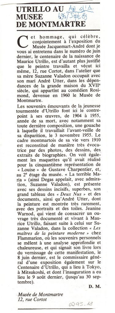 Απόκομμα, χαρτί, 7.5×21.5 εκ., στα γαλλικά, δημοσίευσης κριτικής έκθεσης Maurice Utrillo, η οποία διεξάγεται στο Musée de Montmartre στο Παρίσι. Σχολιάζονται έργα του καλλιτέχνη που παρουσιάζονται σε αυτή.