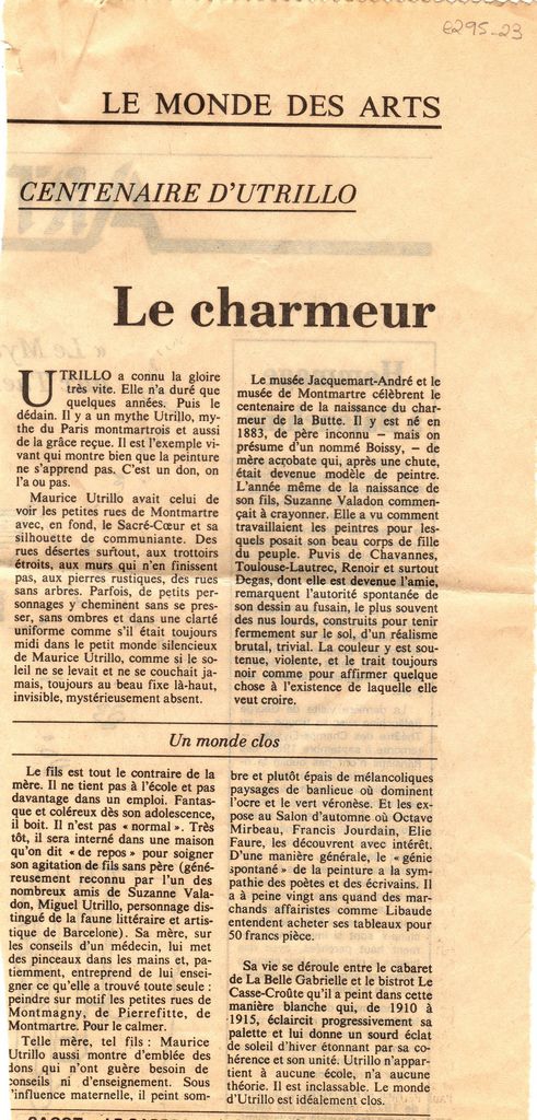 Απόκομμα, χαρτί, 2 φφ, 12.5×22.5 εκ., στα γαλλικά, δημοσίευσης κριτικής αναδρομικών εκθέσεων αφιερωμένων στον Maurice Utrillo, με αφορμή τη συμπλήρωση 100 χρόνων από την γέννηση του καλλιτέχνη. Αναγράφονται λεπτομέρειες για το εικαστικό έργο του και τις εκθέσεις.