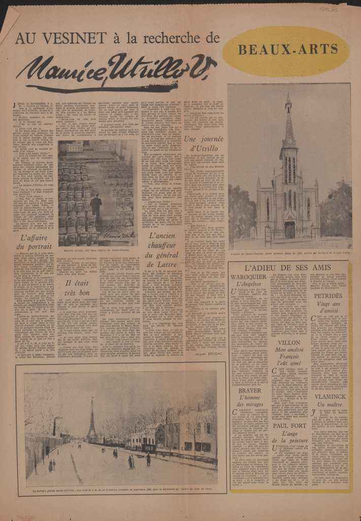 Απόκομμα, χαρτί, 2 φφ, 10.5×12 και 60×42 εκ., στα γαλλικά, δημοσίευσης άρθρου αναφερόμενου στον Maurice Utrillo. Περιγράφεται επίσκεψη του γράφοντος στην περιοχή Le Vesinet προκειμένου να ανακαλύψει πτυχές της ζωής του καλλιτέχνη. Αναγράφονται αναμνήσεις ανθρώπων της περιοχής που γνώριζαν τον καλλιτέχνη.