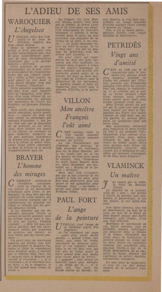 Απόκομμα, χαρτί, 60×42 εκ., στα γαλλικά, δημοσίευσης κειμένων αφιερωμένων στον Maurice Utrillo με αφορμή τον θάνατο του καλλιτέχνη. Γράφουν οι Waroquier, Brayer, Villon, Fort, Vlaminck, Πετρίδης.