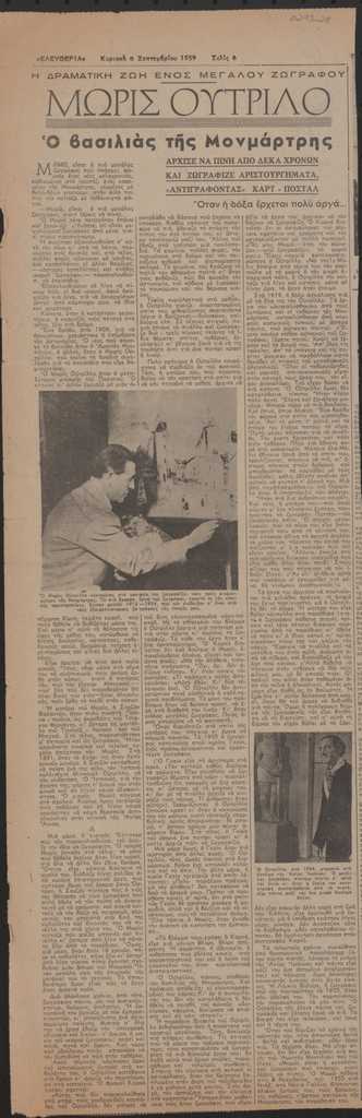 Απόκομμα, χαρτί, 52×17 εκ., στα ελληνικά, δημοσίευσης άρθρου αναφερόμενου στη ζωή του Maurice Utrillo. Αναγράφονται λεπτομέρειες για το ξεκίνημα της ενασχόλησής του με τη ζωγραφική.