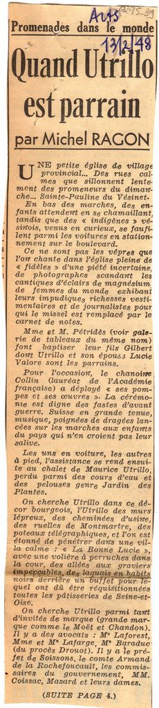 Απόκομμα, χαρτί, 2 φφ, 23.5×5 και 33×5 εκ., στα γαλλικά, δημοσίευσης άρθρου το οποίο αναφέρεται σε βάπτιση όπου ήταν νονός ο Maurice Utrillo. Αναγράφονται λεπτομέρειες.