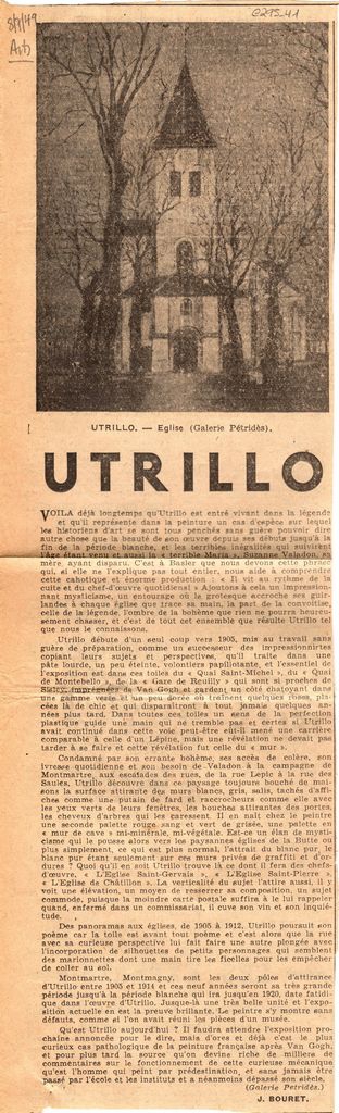 Απόκομμα, χαρτί, 36×11 εκ., στα γαλλικά, δημοσίευσης κριτικής της ζωγραφικής του Maurice Utrillo, με αφορμή έκθεση η οποία διεξάγεται στην γκαλερί Πετρίδη στο Παρίσι.